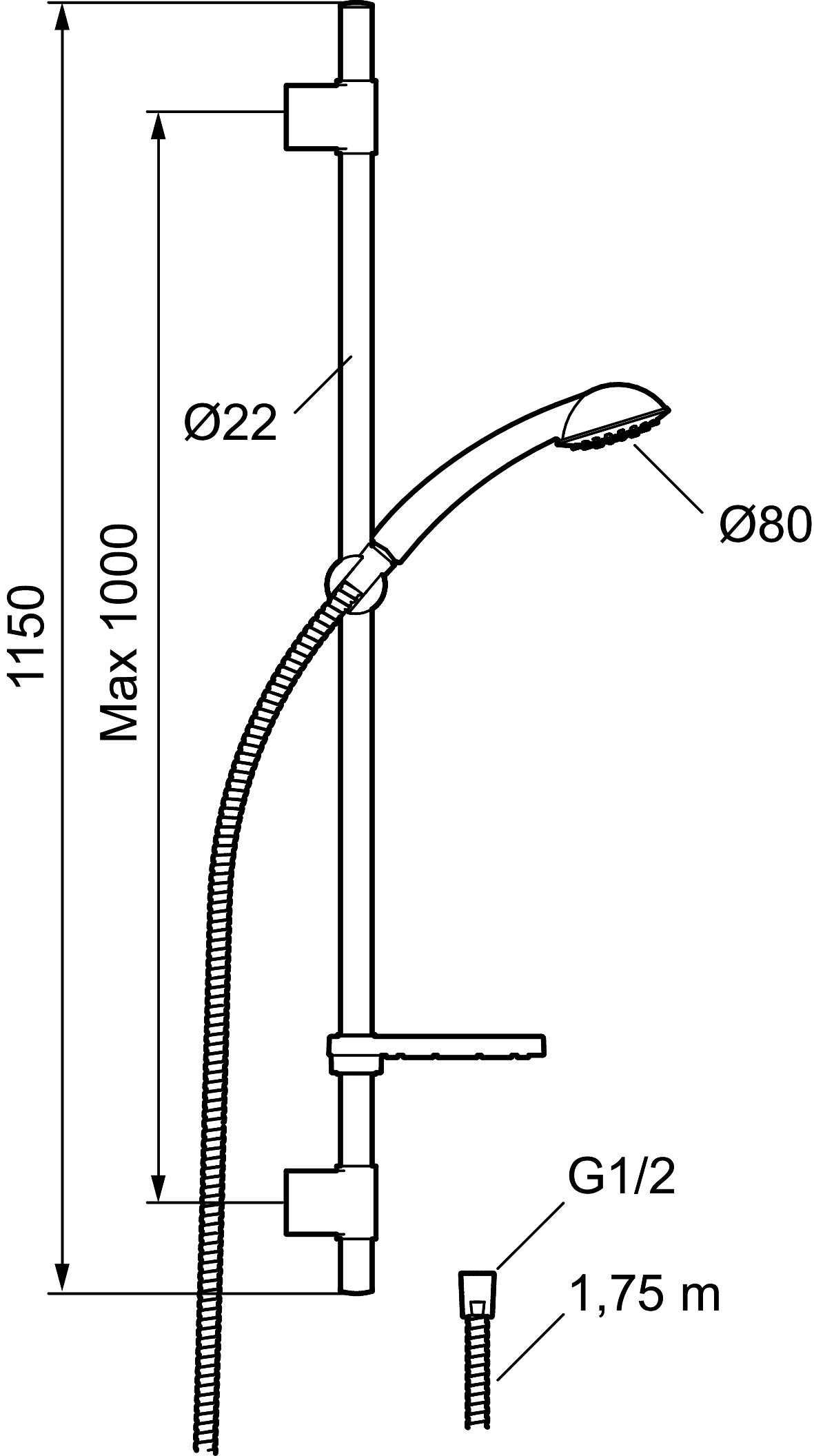 - Douchestang met glijstuk en boven muurbeugel verstelbaar met afdichting