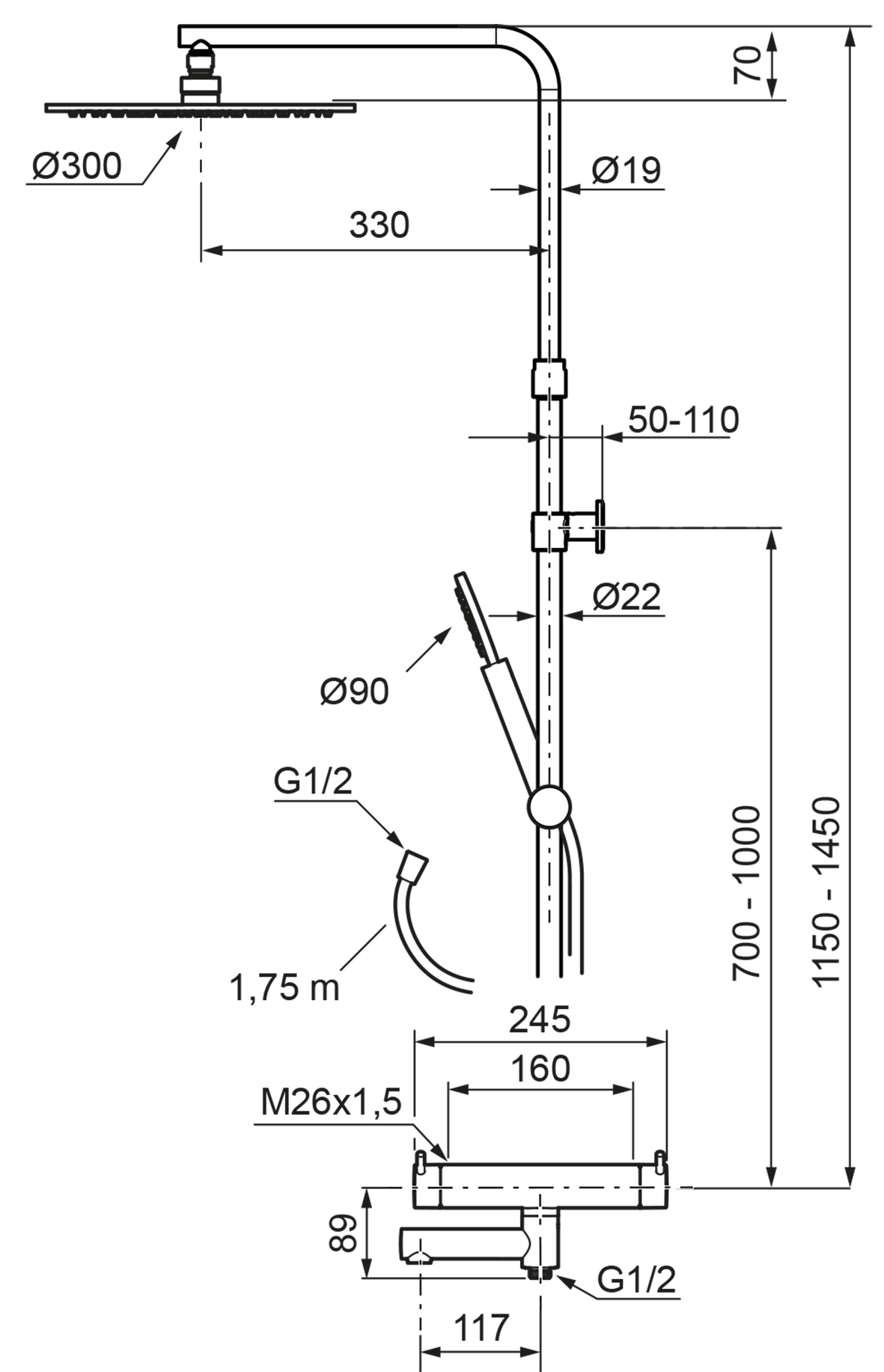- Väggfäste fritt justerbart i höjdled, 700–1000 mm från anslutning och 50–110 mm utsprång från vägg, 2x20 mm distanser medföljer, med väggtätning, dold rörskarv.